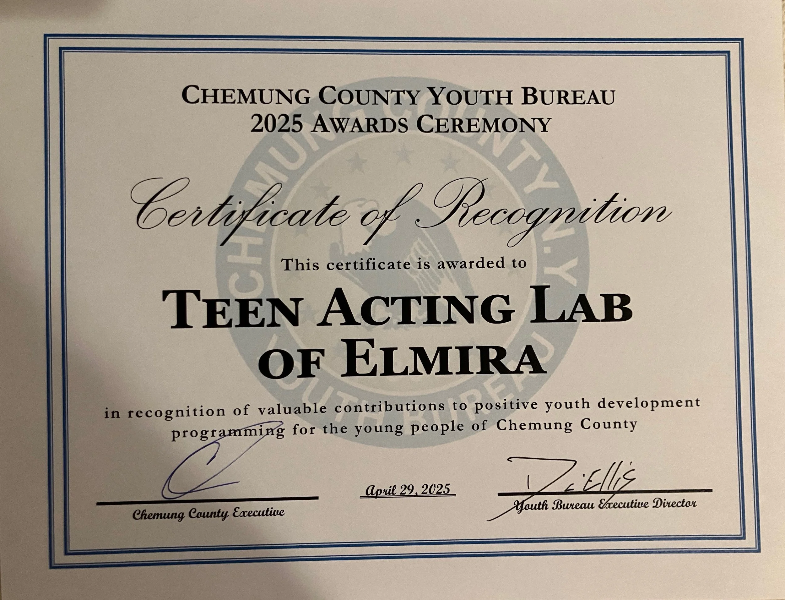 The Teen Acting Lab of Elmira was nominated for a Program Excellence Award by the Chemung County Youth Bureau! A huge honor. Thanks to the CCYB for this distinction, and thanks to The Triangle Fund and The Anderson Foundation for supporting TALE!